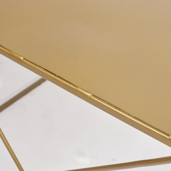The hand-polished metallic top rests on a sturdy, gold/white/black powder coated-finished steel frame, bringing a sense of luxury and minimalism. Its open base structure adds lightness, while the symmetrical linear accents offer subtle visual interest.