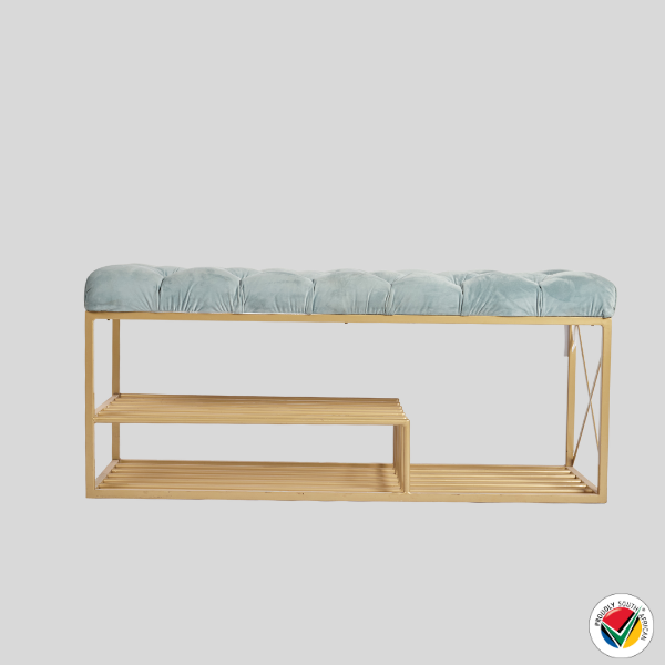 The sleek gold steel frame provides a modern silhouette, while the integrated dual-level shoe rack keeps your footwear neatly arranged and easily accessible. Ideal for compact spaces or as a statement piece in larger rooms.