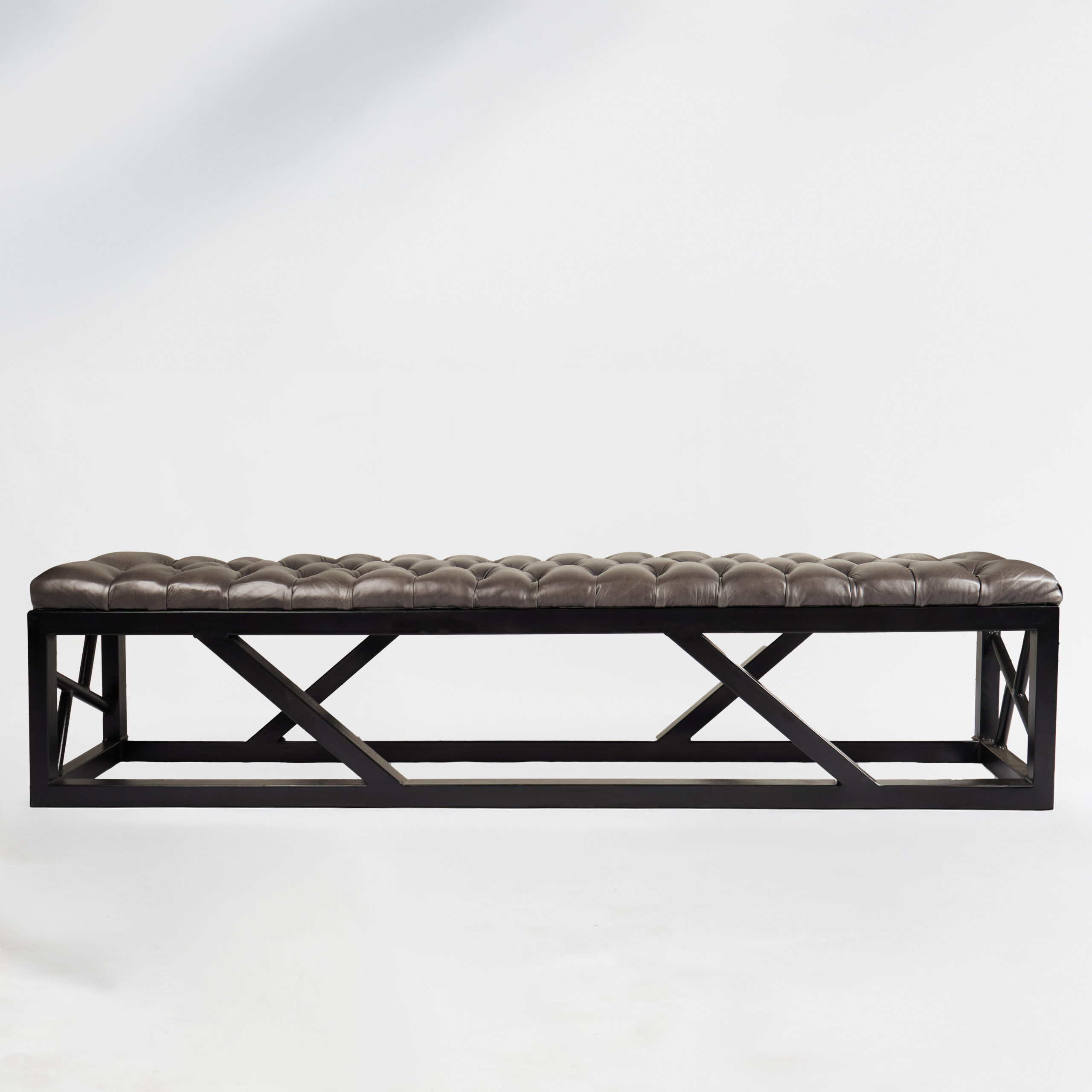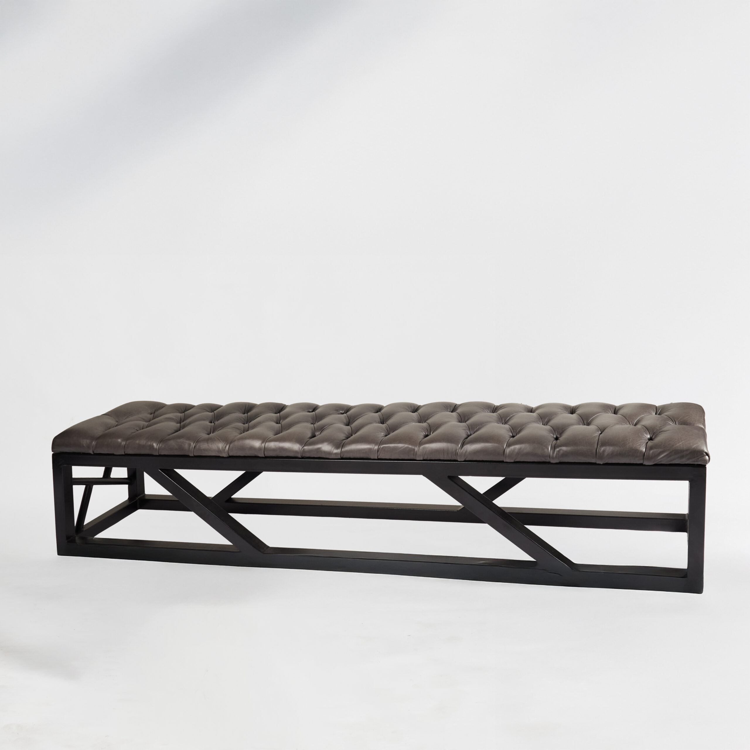 The Manhattan Bench blends luxurious comfort with bold architectural design. Featuring a deep button-tufted cushion upholstered in rich leather-look fabric, it sits atop a striking geometric metal frame. This piece offers both seating and statement-making style, perfect for entryways, living rooms, or boutique interiors.